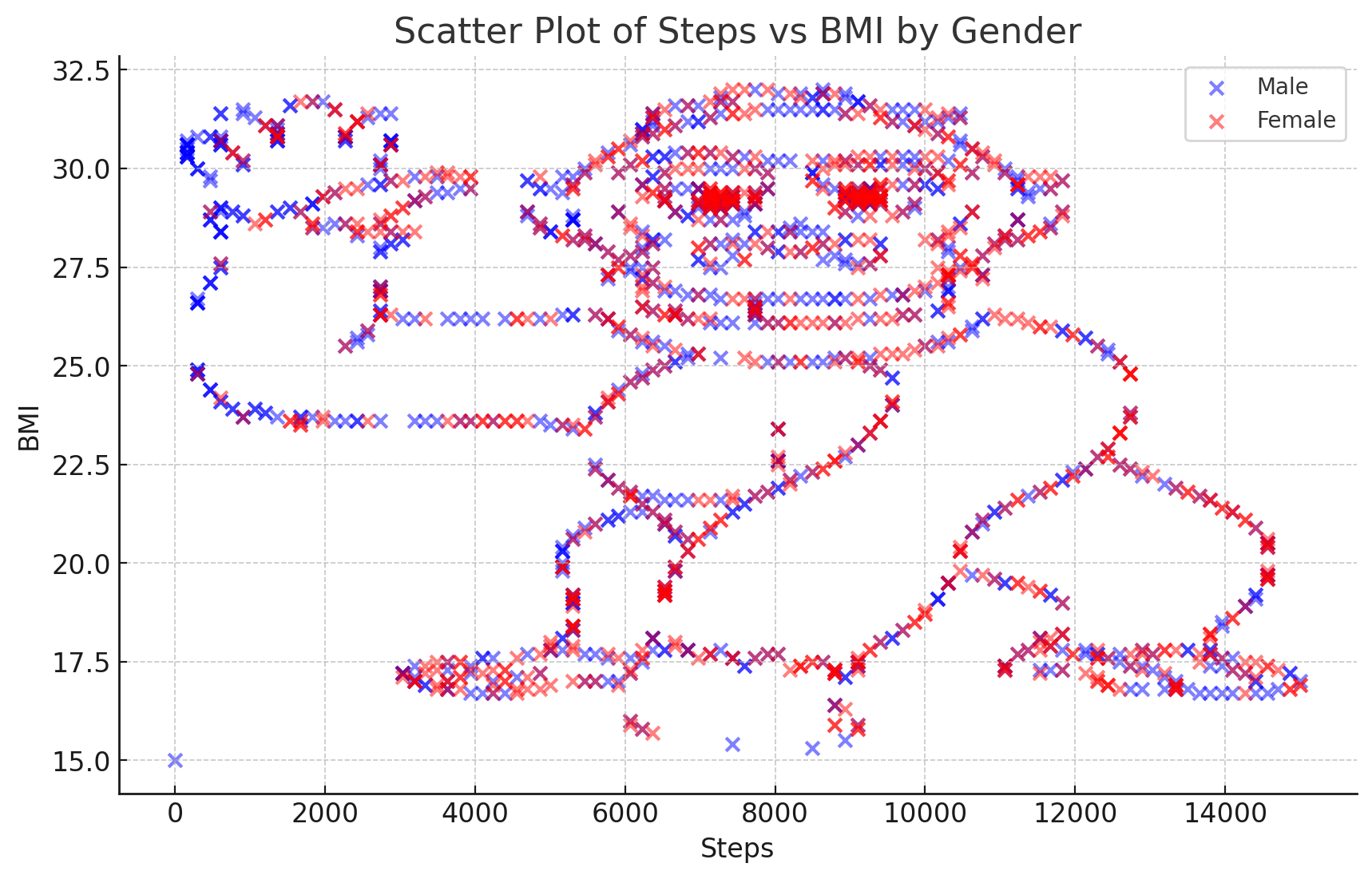 This pattern strongly suggests that this data has been artificially generated or heavily processed. Real BMI and steps data would typically show much more random variation and natural scatter. The regular geometric patterns we see here are characteristic of: - Either synthetic data generated using mathematical functions - Or real data that has been somehow quantized or processed through some kind of algorithm