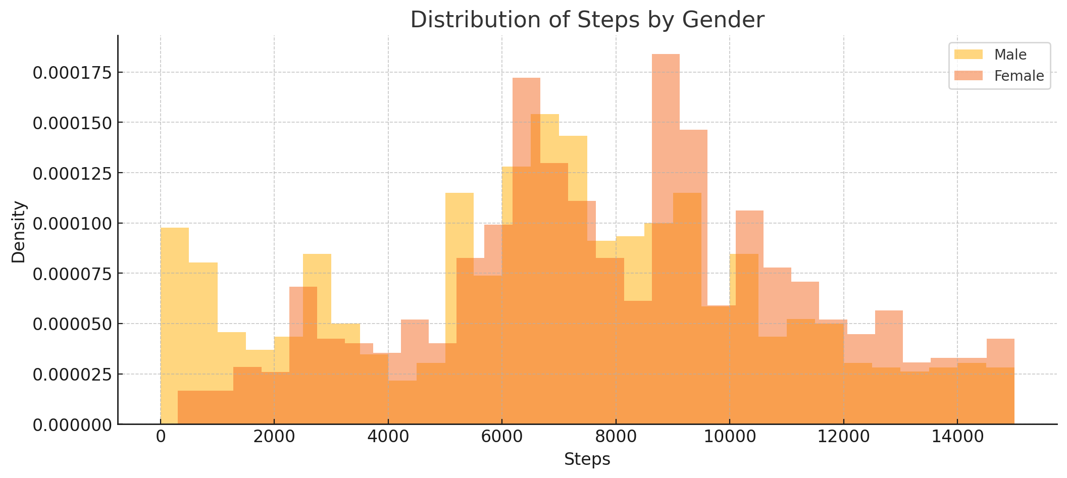 Females take more steps on average (8,014 steps) compared to males (6,891 steps)